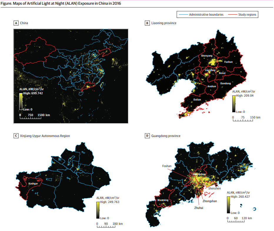 健康的睡眠對(duì)兒童身體發(fā)育和心理健康至關(guān)重要。目前的系統(tǒng)綜述顯示,我國(guó)兒童睡眠問題患病率約高達(dá)37.6%,已成為我國(guó)兒童青少年重大的公共健康問題。因此,識(shí)別導(dǎo)致睡眠障礙的影響環(huán)境因素,并對(duì)其進(jìn)行有效干預(yù)具有非常重要的理論和現(xiàn)實(shí)指導(dǎo)意義?;诖?,中山大學(xué)公共衛(wèi)生學(xué)院董光輝教授團(tuán)隊(duì)在廣東省、遼寧省和新疆維吾爾自治區(qū)(見圖1)共選取14個(gè)城市55個(gè)行政區(qū)的201,994名兒童青少年,利用衛(wèi)星圖像評(píng)估了居住地址500m范圍的室外夜光暴露,并進(jìn)一步探討了室外夜光和兒童青少年睡眠障礙及其亞型的關(guān)聯(lián)性。