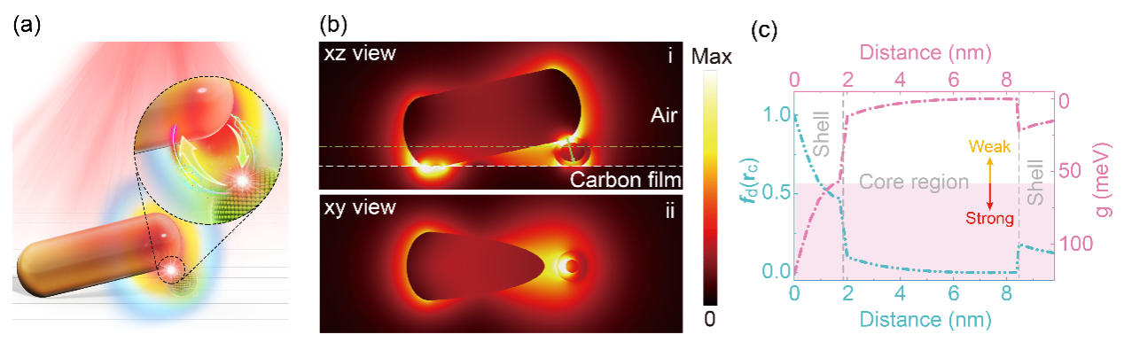 圖 1 (a) 單根金納米棒與單個量子點形成“鍥形腔”構型的強耦合示意圖;(b) 單個Au NR@QD1結構的x-y、x-z電場分布圖,其中量子點被壓在金棒一端的下方。(i)中的綠色虛線是電場分布的x-y視圖數據提取的平面;(c) 歸一化電場、耦合強度與距離(沿(b)中綠色箭頭從金棒到量子點中心)的關系圖?;疑Q虛線中間為量子點核區域,粉色區域示意系統達到輻射強耦合狀態。