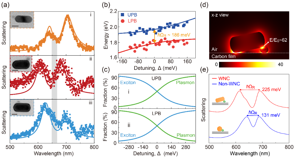 圖 2 (a) 不同失諧量情況下單個Au NR@QD1雜化系統的暗場散射測量結果,其中圖(ii)中的光譜劈裂高達~234 meV;(b) 實驗數據(點圖)及理論計算(線圖)得到的雜化系統色散關系;(c) 色散關系上支(UPB)與下支(LPB)中的等離激元模式、量子點激子的相對占比;(d) “鍥形腔”構型的電場分布圖;(e) 室溫下“鍥形腔”構型與非“鍥形腔”構型的Comsol仿真散射譜結果
