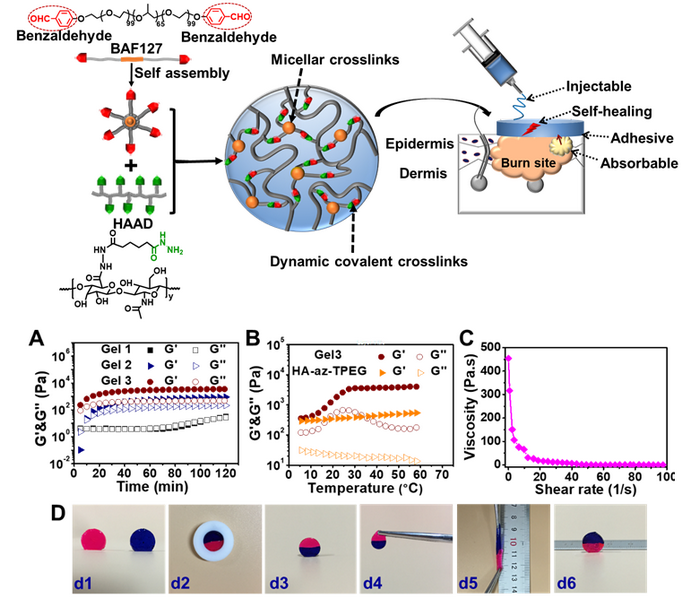 團隊利用了動態共價交聯和自組裝物理交聯的優點構建了智能雙網絡水凝膠,應用于燒傷護理敷料方面。基于酰肼修飾的透明質酸和端基苯甲醛修飾的Pluronic F127之間形成動態酰腙鍵,而F127可在溫和溫度(>25°C)形成疏水物理交聯。物理交聯可為水凝膠貢獻剪切變薄、溫敏性和能量耗散的性質,動態化學和物理雙交聯可提供優異的粘彈性和自愈合(圖2)。深度局部燒傷治療結果表明,該水凝膠具有良好的滲出物吸收和良好的細胞相容性,可促進大鼠皮膚燒傷創面愈合。值得注意的是,此水凝膠通過游離的醛基可與組織上的氨基化學結合表現出組織粘合性,可望解決常規水凝膠敷料易從生理組織脫落的難題。該材料有望作為一種新型多功能水凝膠基燒傷皮膚敷料。該工作以題為“A Hydrogel Crosslinked with Dynamic Covalent Bonding and Micellization for Promoting Burn Wound Healing”發表在 ACS Applied Materials & Interfaces(?2018, 10, 25194),論文鏈接:https://doi.org/10.1021/acsami.8b08165