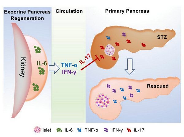 該研究發現干細胞介導的異位新生的胰腺外分泌腺可以修復原位外分泌胰腺、改善炎癥微環境,促進胰島修復以治療糖尿病;機制上發現異位外分泌腺再生通過啟動IL-6/TNF-α/IFN-γ軸發揮抑制IL-17、保護胰島的作用;提出局部組織器官再生治療全身疾病的新理念。