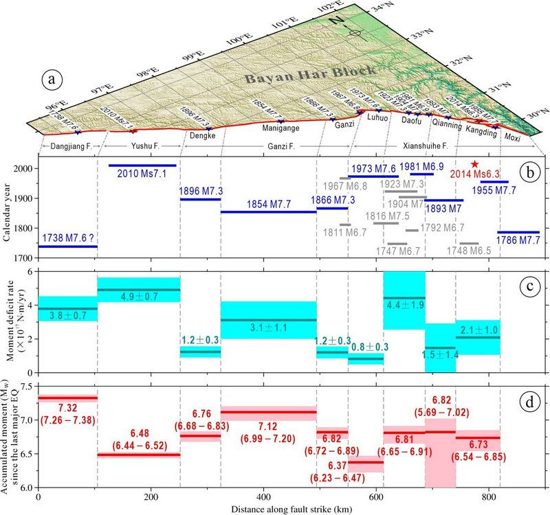 研究結果表明,玉樹-甘孜斷層的左旋走滑速率約為5-6 mm/yr,遠低于鮮水河斷層的12 mm/yr的滑動速率(圖3)。二者滑動速率的差異可能與巴顏喀拉塊體內部不統一的變形模式相關:以龍日壩斷層為界,西側變形比東側表現得更為剛性(圖3)。玉樹-甘孜斷層與鮮水河斷層地震活動的差異可能與它們的構造成熟度有關(圖4):玉樹-甘孜斷層較鮮水河更為成熟,斷層面凹凸體更為整合,所以更傾向于產生7級以上的大地震,如2010年玉樹地震;相反,鮮水河斷層除了7級以上地震外,也會存在許多6-7級的中小型地震(圖5),如2014年康定地震和2022瀘定地震。玉樹-甘孜-鮮水河斷裂帶各段應變積累速率均較高,部分段落(如當江斷層和甘孜斷層的馬尼干戈段)累積的地震矩足以產生7級以上的大地震(圖5)。由于鮮水河斷層更容易發生中小型地震,其地震危險性也應引起重視。