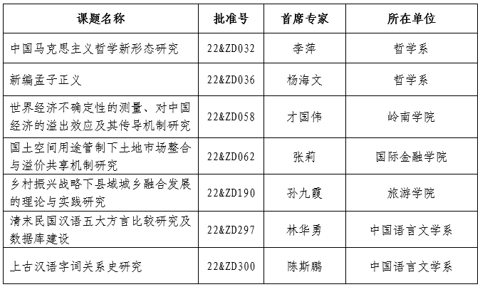 中大新聞網(wǎng)廣州12月9日電(通訊員姜帆)12月8日,全國哲學社會科學工作辦公室公布了2022年度國家社科基金重大項目立項名單,中山大學共有7個項目獲批立項,立項總數(shù)位于全國高校并列第6位,比去年提升1位,為學校“雙一流”建設(shè)奠定堅實的基礎(chǔ)。