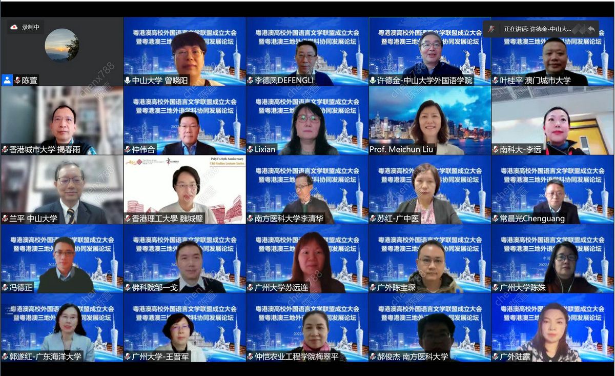 會上,聯(lián)盟發(fā)起單位中山大學(xué)外國語學(xué)院、香港城市大學(xué)人文社科學(xué)院語言及翻譯學(xué)系、澳門大學(xué)人文學(xué)院代表分別致辭。中山大學(xué)外國語學(xué)院院長許德金教授宣讀了首批加入聯(lián)盟的高校名單。之后,與會專家在云端合影留念。