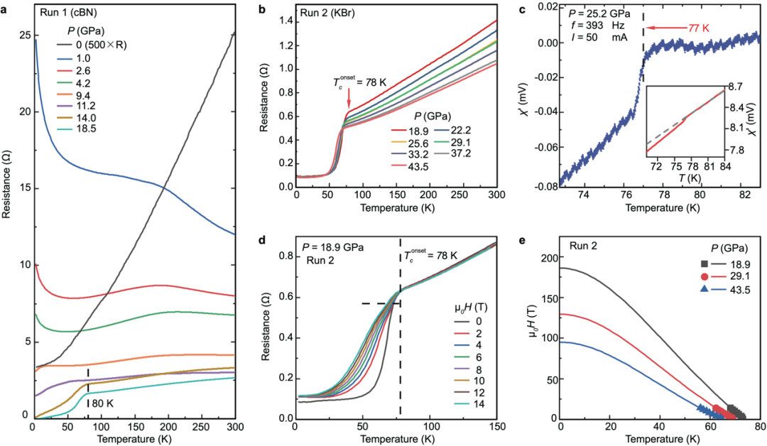 幸運(yùn)的是,這一次,團(tuán)隊(duì)成功了。團(tuán)隊(duì)將La?Ni?O?單晶材料在中山大學(xué)高壓實(shí)驗(yàn)研究平臺(tái)以及華南理工大學(xué)、中國(guó)科學(xué)院物理研究所、北京同步輻射裝置開展實(shí)驗(yàn)研究,很快確定了其在壓力下轉(zhuǎn)變?yōu)槌瑢?dǎo)體,超導(dǎo)轉(zhuǎn)變溫度達(dá)到液氮溫區(qū),高達(dá)80K(開爾文)。