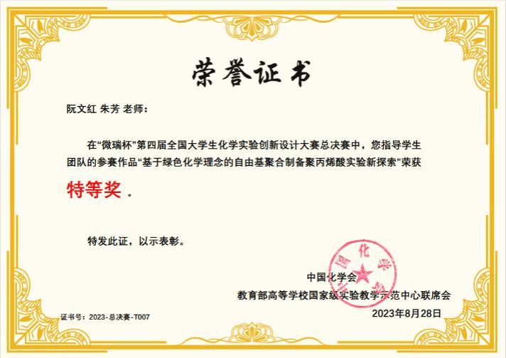 中大新聞網訊(通訊員肖華)8月20-23日,“微瑞杯”第四屆全國大學生化學實驗創(chuàng)新設計大賽總決賽在浙江大學舉行,中山大學化學學院阮文紅、朱芳兩位教授共同指導2021級本科生趙子健、史延新、李世成參賽并榮獲總決賽特等獎,獲獎作品為“基于綠色化學理念的自由基聚合制備聚丙烯酸實驗新探索”。