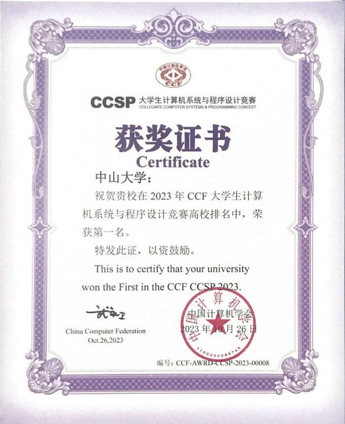 這是我校自2016年參加此項賽事以來首次榮獲團體第一。在10月26日舉行的頒獎會上,CCSP競賽委員會主席、中國工程院院士鄭緯民為我校頒獎,CCF理事長、中國科學院院士梅宏為我校獲獎選手頒獎。