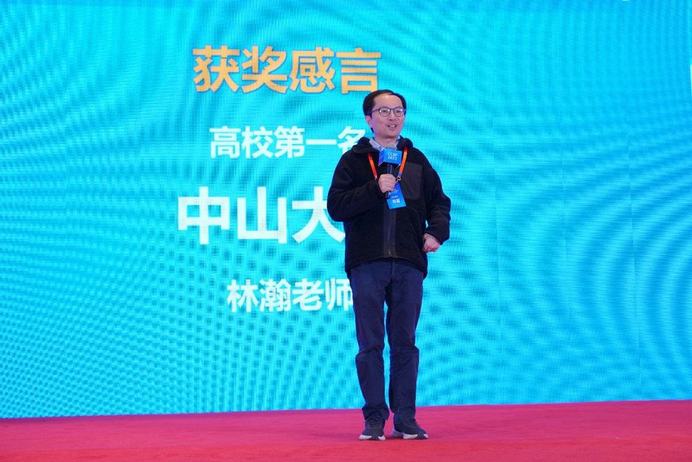 頒獎會上,我校林瀚老師應(yīng)邀發(fā)表獲獎感言。他對CCF為學生們提供展示才華的舞臺和與其他院校同學切磋交流的機會表示感謝,同時也感謝學校和學院對學生參加程序設(shè)計類競賽的支持。