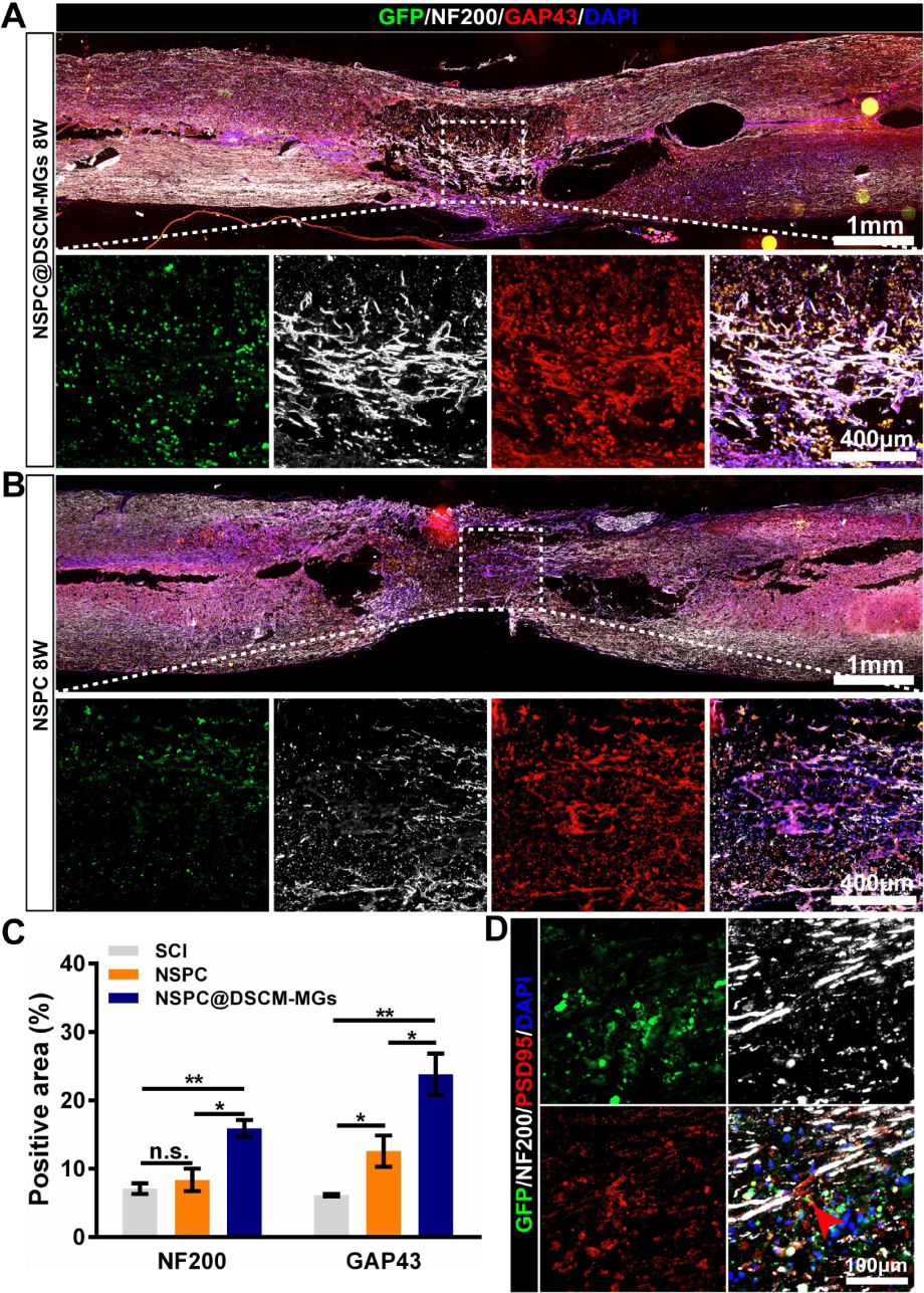 圖3. 移植的NSPC@DSCM-MGs在體內促進軸突再生和神經網絡重建