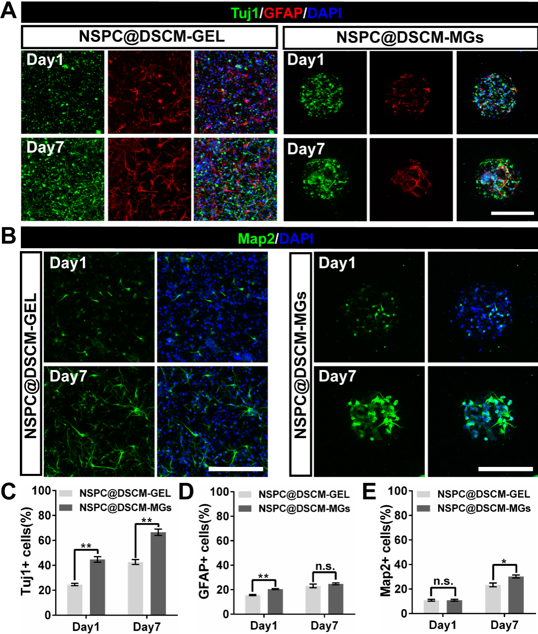 圖2. NSPC@DSCM-MGs在體外預孵育可促進NSPCs向神經元分化
