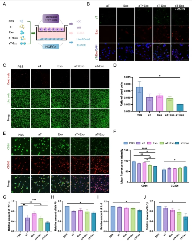 在角膜上皮細胞與M1型巨噬細胞共培養體系中,aT-Exo可以通過促進巨噬細胞M2型極化,顯著降低共培養體系中的TNF-α、MMP9、IL-6和IL-1β表達(圖3)。