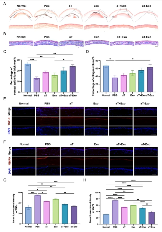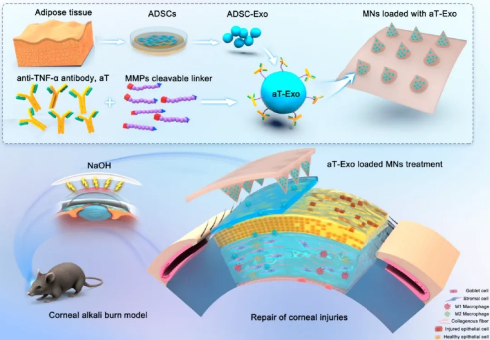 構建小鼠角膜堿燒傷模型,結膜下注射aT-Exo,動態分析證實抗TNF-α抗體修飾的工程化外泌體制備技術,提高aT利用率同時,增強外泌體抗炎特異性,顯著下調堿燒傷角膜炎癥損害并促進角膜損傷修復(圖2)。