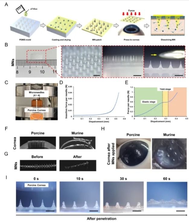 為了克服傳統眼局部給藥,組織穿透性和生物利用度低的局限性,研究團隊采用聚乙烯醇(PVA)構建微針(MNs)陣列,實現工程化外泌體跨角膜上皮遞送。顯示載外泌體微針具有足夠的強度有效穿進角膜基質層,相比于傳統給藥方式,MNs具有更高的角膜藥物利用率和更長的藥物釋放時間,實現外泌體的靶向遞送(圖4)。