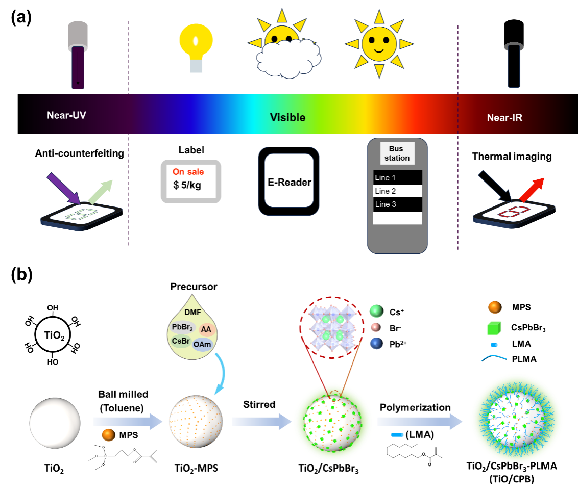 中大新聞網(wǎng)訊(通訊員林銳娜)傳統(tǒng)的光學(xué)防偽技術(shù)大多依賴于靜態(tài)印刷圖像,安全性較低,因此需要開發(fā)具有動態(tài)調(diào)制圖案功能的新型防偽設(shè)備。近日,中山大學(xué)楊柏儒教授團(tuán)隊開發(fā)出了一種新型熒光電泳顯示(EPD)技術(shù)。該團(tuán)隊通過在傳統(tǒng)的電泳粒子TiO?上復(fù)合鈣鈦礦量子點(CsPbBr?),制備了具備熒光特性的電泳粒子,并進(jìn)一步研制了一種多功能防偽器件。該器件不僅響應(yīng)快速、對比度高,而且能夠呈現(xiàn)明亮的綠色熒光,為未來的動態(tài)防偽和識別提供了新思路。這項研究成果以題為“Fluorescent, multifunctional anti-counterfeiting, fast response electrophoretic display based on TiO2/CsPbBr3 composite particles”發(fā)表在《Light: Science & Applications》期刊上,楊柏儒教授為通訊作者,博士生劉廣友為第一作者。此項研究得到了國家重點研發(fā)計劃、科技部項目、廣東省重點地區(qū)研發(fā)計劃等項目的支持。