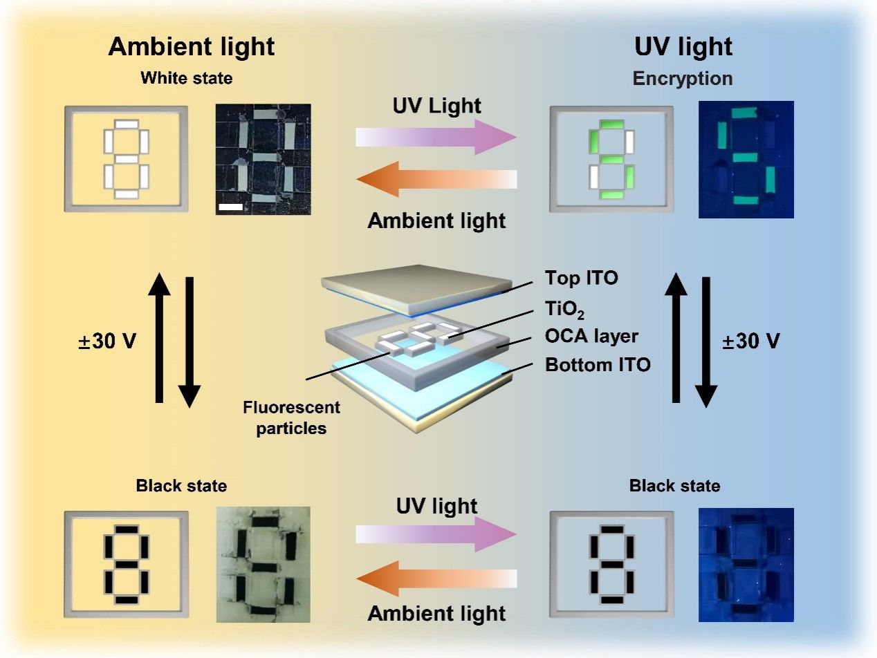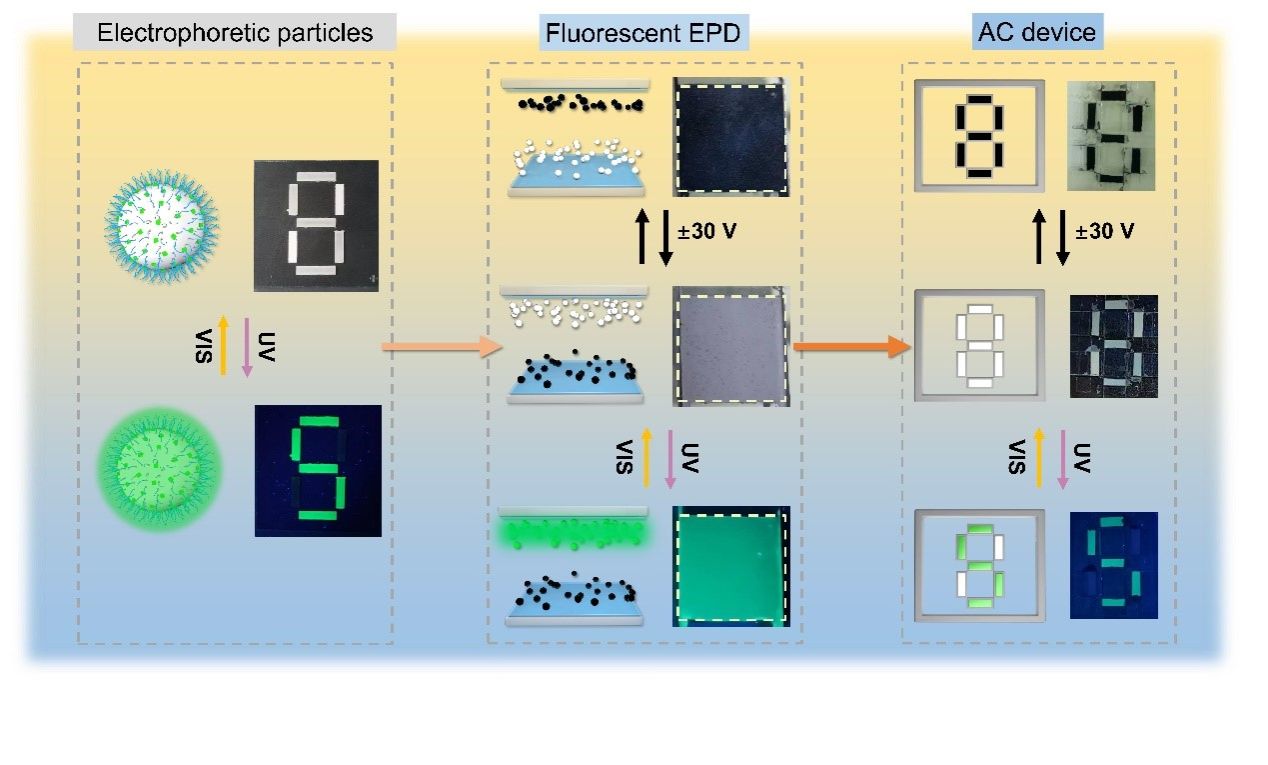 防偽技術(shù)在防止假冒產(chǎn)品和保護(hù)機(jī)密信息方面至關(guān)重要,廣泛應(yīng)用于產(chǎn)品標(biāo)簽、護(hù)照、機(jī)密文件等領(lǐng)域。光學(xué)防偽設(shè)備具有顯示性能好、使用便捷和響應(yīng)速度快等優(yōu)點,但單一功能的防偽技術(shù)存在容易被復(fù)制且安全性不夠的問題。因此,需開發(fā)具備動態(tài)顯示功能的防偽設(shè)備。電泳顯示器件(EPD)因其低功耗、動態(tài)圖像切換和高環(huán)境對比度等優(yōu)勢,成為動態(tài)防偽技術(shù)的理想選擇。然而,目前商用EPD設(shè)備大多僅在可見光條件下工作,顯示性能依賴于光源強(qiáng)度,限制了其在黑暗環(huán)境和非可見光條件下的應(yīng)用。熒光電泳顯示技術(shù)則能使EPD在紫外光下正常工作,拓展了傳統(tǒng)EPD在紫外光場景中的應(yīng)用可能。同時,通過結(jié)合反射和發(fā)射的雙顯示模式,可以實現(xiàn)多模式的動態(tài)防偽應(yīng)用。