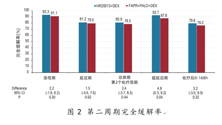 第一周期總體期的完全緩解率分別為77.7% vs 78.2%(差異為-0.9%[95% CI:-6.7,5.0];單側P<0.01),顯示主要終點達到非劣效性(圖1)。同時,該Ⅲ期臨床研究數據顯示出了HR20013在超延遲期的療效,無論是第一周期還是第二周期,HR20013超延遲期完全緩解率數值均高于FAPR+PALO(第一周期:90.3% vs 86.5%;第二周期:92.7% vs 87.8%;圖1、2)。