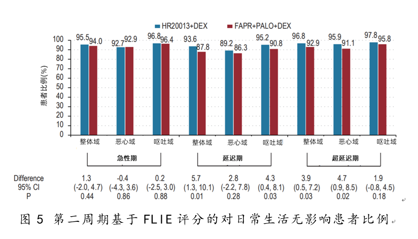 在第一周期的3個階段[急性期、延遲期和超延遲期]中,兩組的對日常生活無影響(NIDL)患者比例在整體域、惡心域和嘔吐域大體相當(所有的名義雙側P>0.05;圖4)。在第二周期中,與FAPR+PALO+DEX組相比,HR20013+DEX組的整體域延遲期(93.6% vs 87.8%;名義雙側P=0.01)、嘔吐域延遲期(95.2% vs 90.8%;名義雙側P=0.03)、整體域超延遲期(96.8% vs 92.9%;名義雙側P=0.03)、惡心域超延遲期(95.9% vs 91.1%;名義雙側P=0.02)對日常生活無影響(NIDL)患者比例更高(圖5)。