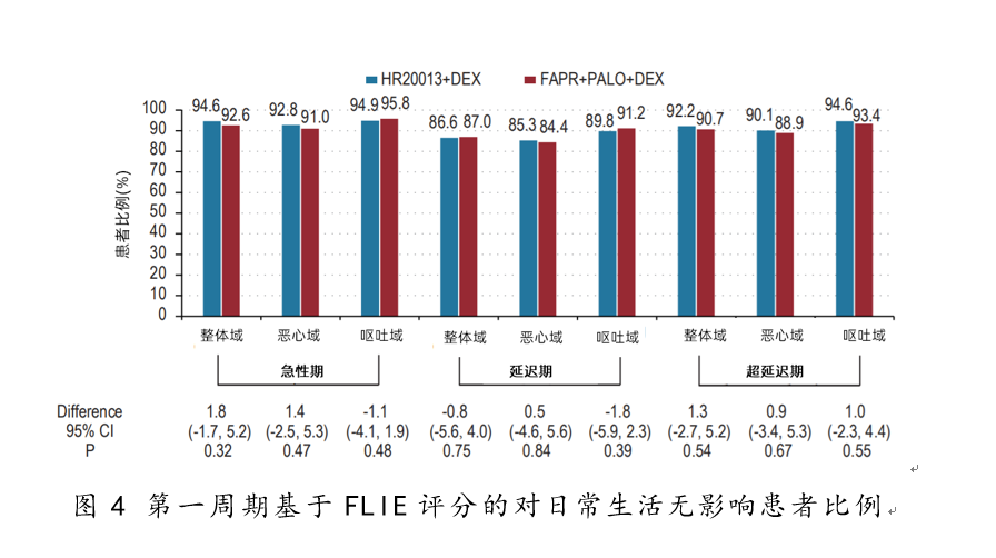 研究結果顯示,HR20013+DEX在預防惡心嘔吐的療效不劣于FAPR+PALO+DEX,并且具有良好的安全性。此外,研究還發現HR20013+DEX可能在超延遲期提高臨床獲益。與FAPR+PALO+DEX相比,HR20013+DEX在接受HEC化療的患者中顯示出改善生活質量的潛力,尤其是在延遲期和超延遲期。