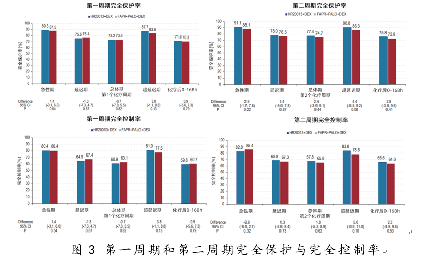在超延遲期階段,HR20013+DEX組的完全保護率(CP;無嘔吐/無挽救治療/無顯著惡心[視覺模擬量表得分<25mm])和完全控制率(TC;無嘔吐/無挽救治療/無惡心[視覺模擬量表得分<5mm])數值上優于對照組,尤其是在第二周期(CP:90.8% vs 86.3%;TC:83.8% vs 78.6%;圖3)。