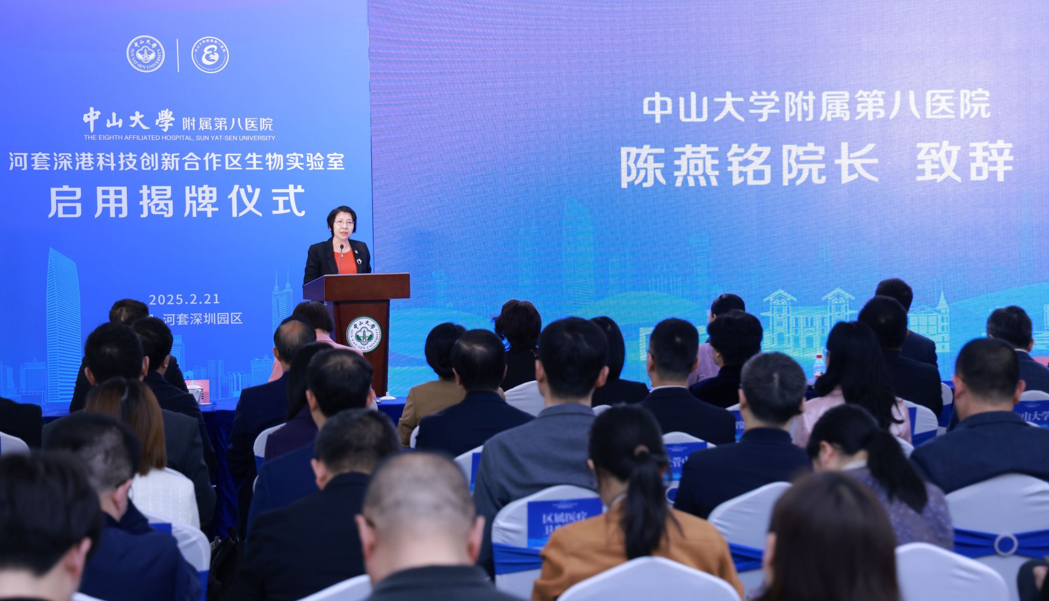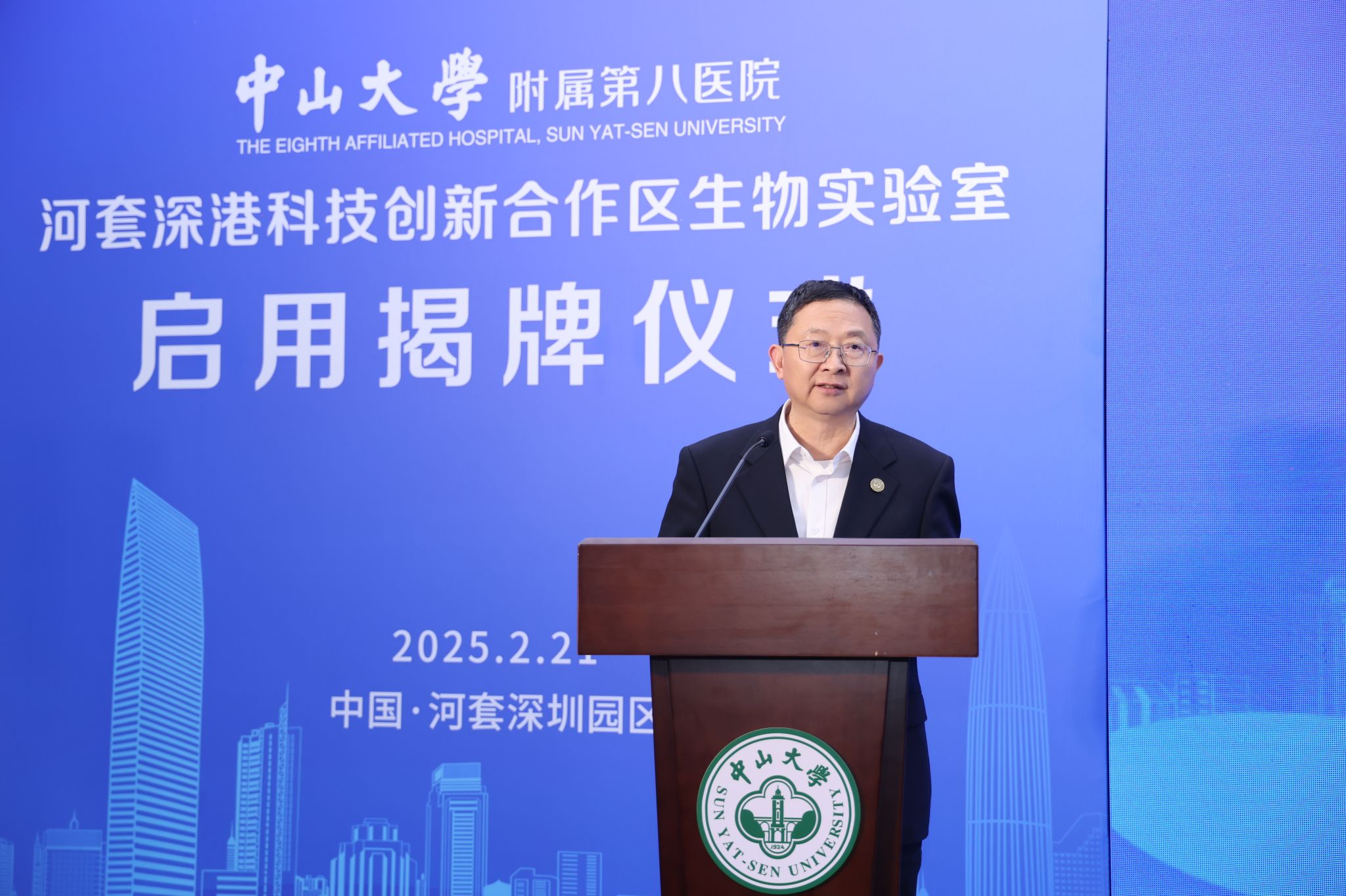 中山大學校長、中國科學院院士高松在揭牌儀式上講話。他強調,附屬第八醫(yī)院河套實驗室正式啟用,對于進一步完善中山大學在香港和河套的啞鈴型布局,加強中大服務國家戰(zhàn)略和灣區(qū)需要的能力建設具有重要意義。