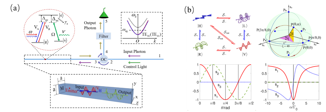 光子具有多自由度編碼、長相干時間和超快傳輸速度等優(yōu)點,成為理想的信息載體。光子集成芯片具有高穩(wěn)定性、高可擴展性、微型化以及高移動性等優(yōu)點,近年來受到廣泛的關注。偏振是光子信息編碼的最重要資源,但在光子芯片上對光子的偏振態(tài)實現(xiàn)按需的任意調控一直是一個巨大的挑戰(zhàn)?;陔p折射晶體或者法拉第磁光效應等方法的傳統(tǒng)偏振極化器一般體積較大,很難片上集成。盡管溫控折射率調控等方法被提出用于片上實現(xiàn)光子偏振的轉化調控,但是整個結構的體積仍然較大,且響應速度較慢。為克服這一重大挑戰(zhàn),該團隊提出一種片上光子偏振調控的量子光學新方法:將一個三能級量子輻射子(原子或分子或量子點)集成于光波導中,使其與兩個正交偏振波導模相互作用,并通過外部相干光場進行調控,從而實現(xiàn)對輸入光子偏振的按需轉化。該方法具有以下突出優(yōu)勢:首先,偏振轉換器是原子尺度,非常有利于片上集成;其次,通過調節(jié)外部相干驅動場的頻率和強度,可以在寬帶范圍內按需操控偏振轉換,而無需改變結構,且響應速度快;第三,由于類電磁感應透明(EIT-like)效應,該方法具有良好的抗耗散能力和高轉換效率。該工作為實現(xiàn)片上光子偏振編碼和按需調控提供了一種有效的解決方案,將推動高密度信息編碼和信息處理光量子集成芯片的發(fā)展。