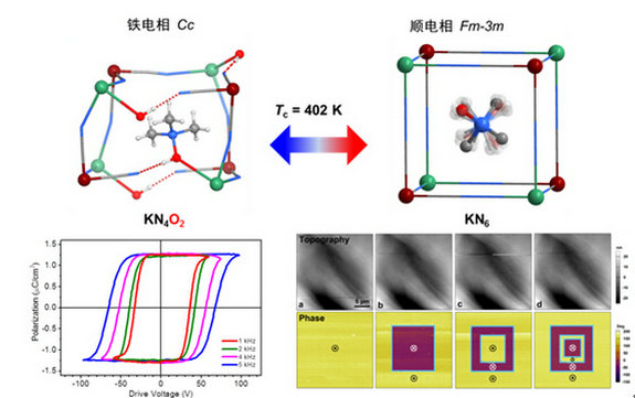 分子鈣鈦礦型鐵電體[(CH3)3NOH]2[KFe(CN)6]中涉及配位鍵斷裂與重組的結構相變,典型的電滯回線及微觀鐵電疇的極化反轉