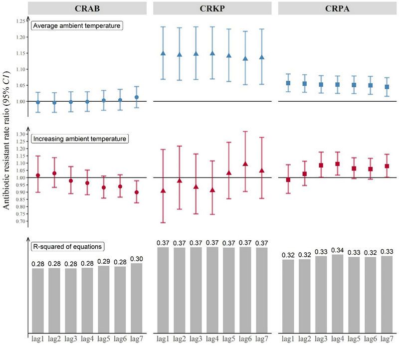圖2 氣溫和氣候滯后變化上升1℃時的抗菌藥物耐藥風險變化
