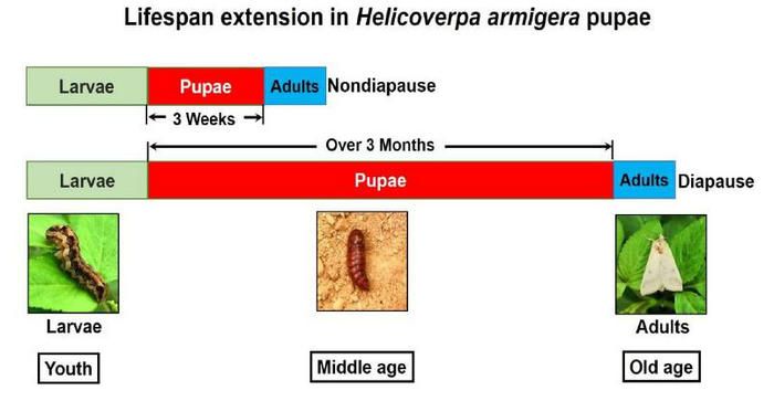 昆蟲滯育(diapause)類似動物冬眠,是物種為了生存而進化出來的重要策略,因為在寒冷地域不滯育就面臨死亡。我們以農業害蟲--棉鈴蟲(Helicoverpa armigera)的蛹滯育為研究對象開展工作,蛹期相當中年期,蛹滯育和生命延長同義,屬于healthspan范疇(如下圖示)。我們在過去發現了第一例自然發生的、生理水平的ROS作為胞內信號調節棉鈴蟲腦中胰島素信號路徑來實現生命延長 (2017,PNAS)的前期工作基礎上,深入開展FoxO延長生命的機制研究。