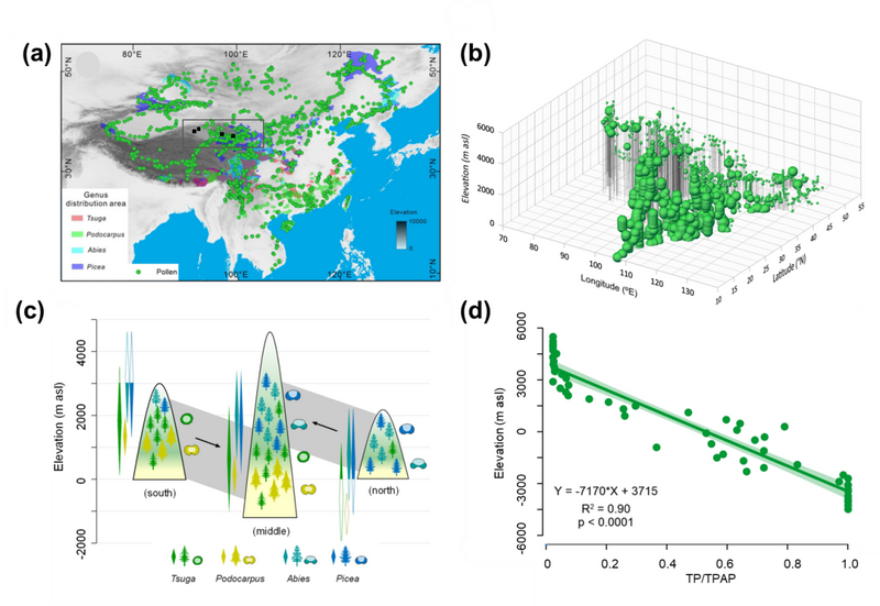 圖1. 東亞表土孢粉數(shù)據(jù)庫(kù)3088個(gè)點(diǎn)位TP/TPAP 比值的空間分布及其與中值海拔定量關(guān)系