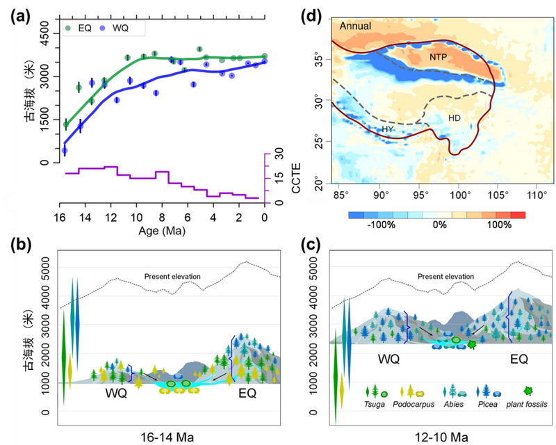 研究結(jié)果揭示,青藏高原東北部柴達(dá)木盆地東、西段山體在距今1500萬(wàn)年前的海拔分別為1332±189米和433±189米,隨后東段山體在1100萬(wàn)年前迅速抬升到3685±87米,西段山體則在700萬(wàn)年前抬升至3589±62米,已接近現(xiàn)代高度(圖2a);而盆地海拔在1600-1400萬(wàn)年前為1102±429米,并于1100萬(wàn)年前抬升至2355±703米 (圖2b-c)。研究團(tuán)隊(duì)進(jìn)一步利用高分辨率區(qū)域氣候模式RegCM 4.6定量評(píng)估了高原東北部隆升對(duì)高原自身及周邊地區(qū)氣候的影響,發(fā)現(xiàn)如果高原東北部降低到現(xiàn)在海拔的1/3,該區(qū)域年降水量則減少50%以上,而高原南部喜馬拉雅山脈和東南部的橫斷山區(qū),降水量則分別增加50%和150% (圖2d),這主要是山脈雨影效應(yīng)增強(qiáng)和區(qū)域環(huán)流變化共同影響所致。這一認(rèn)識(shí)與柴達(dá)木盆地西部耐旱植物孢粉含量增加以及粗骨魚出現(xiàn)指示的氣候變干相吻合;而在喜馬拉雅山和橫斷山區(qū),由于降水量的顯著增加和高地形的存在支撐了該區(qū)域豐富的生物多樣性。這項(xiàng)研究表明青藏高原東北部隆升產(chǎn)生的氣候效應(yīng)顯著影響了青藏高原地區(qū)的氣候和生物演化。
