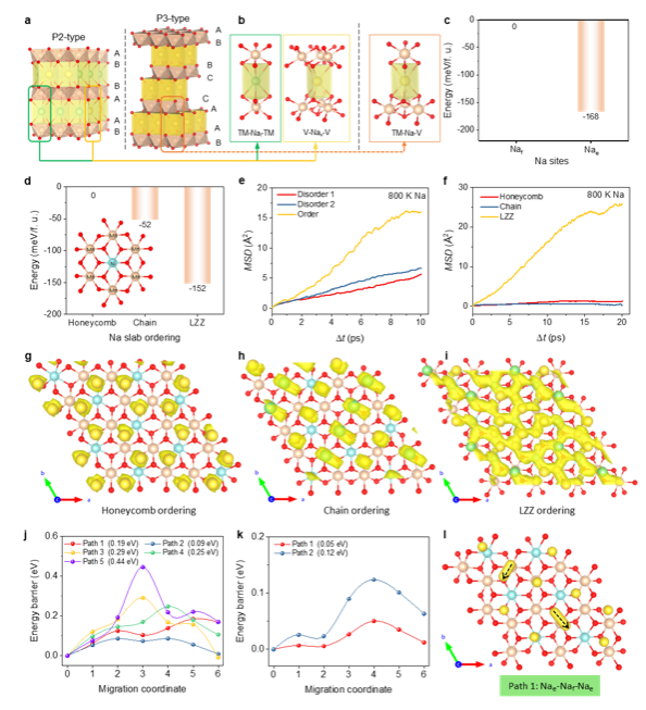 通過第一性原理計(jì)算,進(jìn)一步闡釋了P相層狀氧化物中鈉層中鈉離子與空位形成有序無序結(jié)構(gòu)的基礎(chǔ)。如圖2 所示,由于P2相材料中過渡金屬層的堆垛方式與P3相不同造成其中鈉離子存在高能位與低能位兩種鈉位點(diǎn)。有意思的是,當(dāng)P2-Na2/3Ni1/3Mn2/3O2相材料中呈現(xiàn)實(shí)驗(yàn)觀測的大的“鋸齒型”排列的方式時,這種占據(jù)方式形成能更低,且分子動力學(xué)模擬中的鈉離子概率密度圖2i中鈉離子擴(kuò)散通道最通暢。此外,過渡態(tài)搜索的計(jì)算也揭示了,相比于無序占據(jù),“鋸齒型”排列中的鈉離子更傾向于以協(xié)同輸運(yùn)的方式進(jìn)行傳輸?shù)模@也和van Hove關(guān)聯(lián)分析結(jié)果相互印證。當(dāng)這種有序打破或者降級成其他類型的有序占據(jù),鈉離子自擴(kuò)散系數(shù)大大下降。