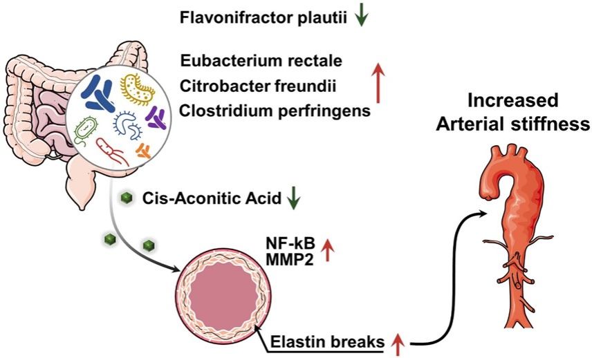 本研究首先通過(guò)宏基因組——代謝組——表型組多組學(xué)聯(lián)合分析發(fā)現(xiàn)Flavonifractor plautii是調(diào)節(jié)血管硬化程度的關(guān)鍵菌種,其相對(duì)豐度在動(dòng)脈僵硬程度高的人群中顯著降低。順烏頭酸是Flavonifractor plautii調(diào)節(jié)動(dòng)脈硬化程度的關(guān)鍵效應(yīng)分子。