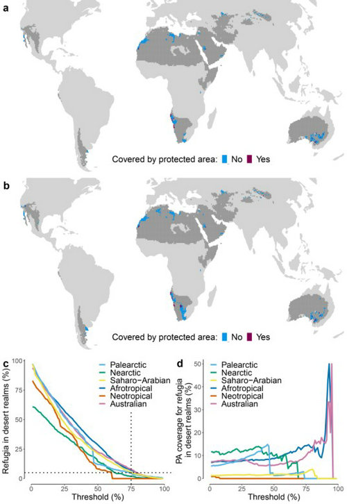 圖3 當(dāng)全球平均氣溫相比工業(yè)化前升高2°C時(shí),荒漠鳥(niǎo)類的氣候避難所及其保護(hù)現(xiàn)狀。小圖a展示的氣候避難所是每個(gè)荒漠區(qū)系內(nèi)氣候變化對(duì)鳥(niǎo)類影響處于最低25%且鳥(niǎo)類多樣性處于最高25%的地區(qū)。小圖b展示的氣候避難所在每個(gè)荒漠區(qū)系中均占總面積的5%,根據(jù)氣候變化影響和鳥(niǎo)類多樣性選取避難所時(shí)采用的統(tǒng)一百分位閾值則根據(jù)這一要求在荒漠區(qū)系間浮動(dòng)。小圖c展示了統(tǒng)一百分位閾值與每個(gè)荒漠區(qū)系中被選定為避難所的區(qū)域面積百分比之間的關(guān)系。小圖d展示了百分位閾值與每個(gè)荒漠區(qū)系中被選定為避難所的區(qū)域被保護(hù)區(qū)覆蓋的比例之間的關(guān)系。