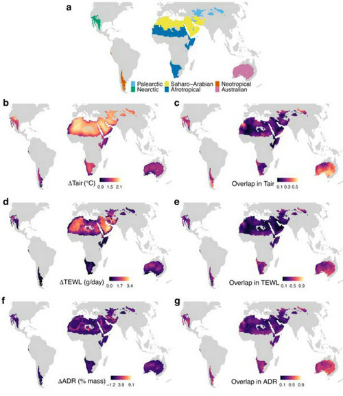 圖2 當(dāng)全球平均氣溫相比工業(yè)化前升高2°C時(shí),氣候變化對(duì)全球荒漠鳥(niǎo)類的影響。在小圖b、d和f中分別以平均氣溫(Tair;°C),最熱月日均蒸發(fā)失水(TEWL;g/天)和急性脫水風(fēng)險(xiǎn)(ADR;%mass)來(lái)表示氣候變化的影響,“Δ”表示數(shù)值的變化,變化越大影響越大(暖色)。在小圖c, e和g中分別以平均氣溫(Tair;°C),最熱月日均蒸發(fā)失水(TEWL;g/天)和急性脫水風(fēng)險(xiǎn)(ADR; %mass)的當(dāng)前值(1986-2015)和未來(lái)值之間的重疊比例來(lái)表示氣候變化的影響,重疊越小影響越大(冷色)。小圖a展示了六個(gè)主要荒漠區(qū)系的位置。