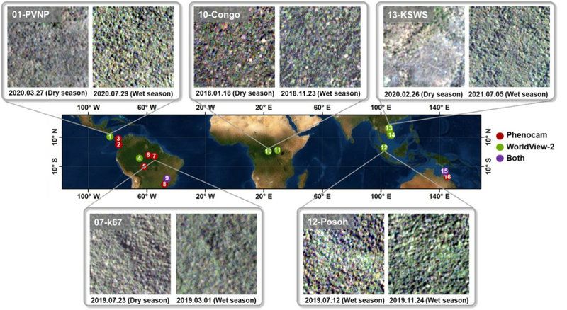 該研究在具有大降水梯度(1,470-2,819 毫米每年)的 16 個熱帶森林地點(圖1)測試了該方法的有效性。在這些站點中分別使用超高分辨率衛星 WorldView-2(n=9 個站點)和地面物候相機 phenocams(n=9 個站點)對微小衛星(PlanetScope)獲取的落葉度進行了精度評估。