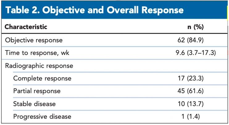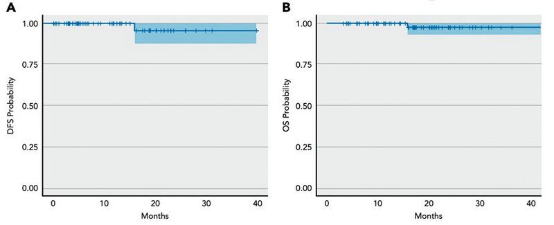 研究納入了來自國內三家中心73名接受PD-1抗體新輔助免疫治療的結直腸癌患者。結果顯示,84.9%的患者獲得客觀緩解,其中23.3%為臨床完全緩解采取觀察等待策略。即便對于局部分期較晚的患者,客觀緩解率也達到了84%。在接受手術的患者中,有近60%的患者獲得病理完全緩解。平均隨訪了17.2個月后,中位無病生存期(DFS)和中位總生存期(OS)均未達到。在接受手術和達到完全緩解的患者中,2年腫瘤特異性無病生存率和總生存率均為100%。