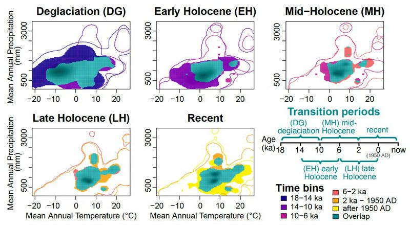 圖1 氣候黏性示意圖。研究分析了過去兩萬年五個(gè)年代區(qū)間的植物的生態(tài)位的變化,顏色斑塊為不同時(shí)期植物的生態(tài)位,線塊為該時(shí)期的背景氣候特征。示意圖以白蠟樹屬(Fraxinus)為例。