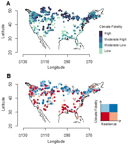 研究結(jié)果也暗示,現(xiàn)代北美地區(qū),氣候黏性較強(qiáng)的植物多集中在地形復(fù)雜、微氣候異質(zhì)性高、但是地理連通性差的地區(qū)。這對(duì)物種來說是件好事情:多樣化的微氣候環(huán)境方便植物近距離擴(kuò)散到適宜的生存環(huán)境。但是,一旦氣候變化程度超過了當(dāng)?shù)厮菁{的氣候環(huán)境閾值,較差的地理連通性意味著植物很難從本地?cái)U(kuò)散到其它地區(qū)。文章也提醒保護(hù)生物學(xué)家應(yīng)對(duì)這些地區(qū)多加重視,適當(dāng)?shù)夭扇〈胧┮詭椭锓N在這些地區(qū)擴(kuò)散。