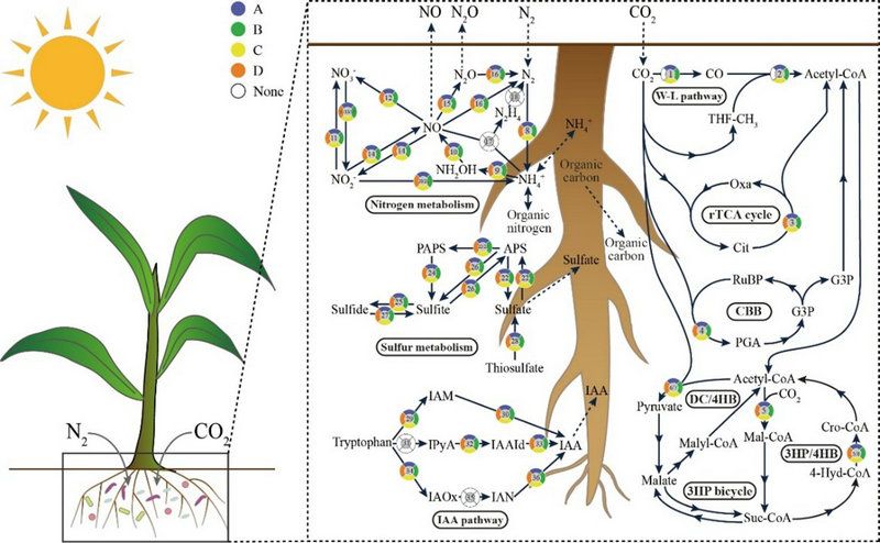中山大學生命科學學院李文均教授團隊以埃及西奈沙漠的多個沙漠農場為研究對象,利用宏基因組和培養組的技術方法對沙漠農作物根際微生物的多樣性和生態功能進行深入研究,分析(1)宿主植物和(2)由地理位置帶來的環境差異對根際微生物群落塑造作用,并深入探究了沙漠農場的農作物根際微生物群落組成和功能多樣性,以期為沙漠環境下農作物的根際微生物群落的研究提供新的見解。該研究結果顯示,西奈沙漠農場微生物類群的多樣性很高,且包含很高比例的新微生物類群,表明了沙漠環境中微生物資源開發與利用的潛力(圖1);基于統計分析的方法,證明了由地理位置帶來的環境差異比宿主植物更能影響根際微生物群落;值得注意的是,通過群落功能與功能微生物類群分析,揭示了群落組成存在顯著差異的根際微生物群落具有相似的群落代謝功能,但參與這些群落代謝過程的功能微生物類群存在顯著差異(圖2、3)。最后,基于研究結果,作者首次提出了“土脈-菌脈”(soil-bacteria veins)的概念。該研究進一步為土壤微生物菌劑的設計提供了指導性的建議,即向植物根際土壤中添加參與植物-微生物互作相關功能且能適應特定環境的微生物類群比直接添加某些特定微生物類群更加重要(圖4)。