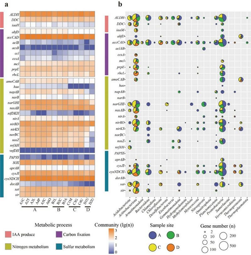 圖2. 不同樣點的群落功能基因豐度和功能微生物類群組成