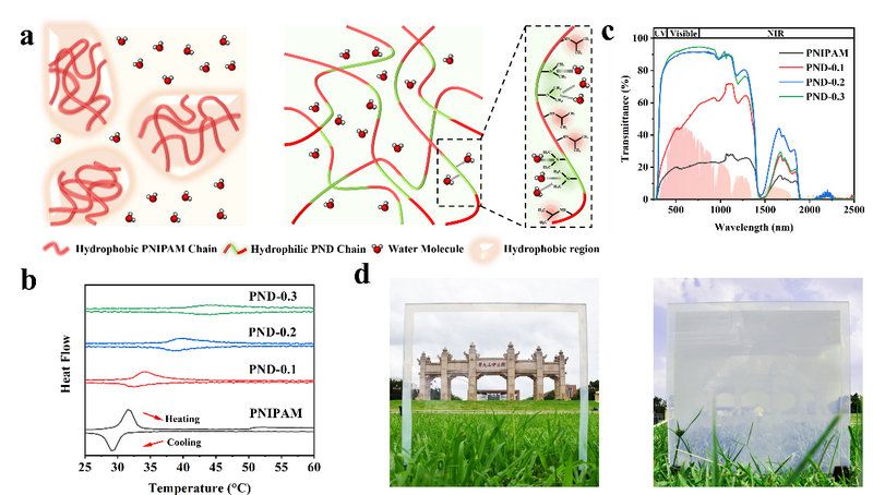 中山大學材料科學與工程學院付俊教授課題組和福州大學江獻財副教授課題組合作開發了一種能夠滿足不同氣候條件需要的熱致變色水凝膠智能窗戶,通過連續調節水凝膠的相轉變溫度,實現了不同緯度地區、不同季節的室內溫度調節。聚N-異丙基丙烯酰胺(PNIPAM)是著名的LCST(低臨界共溶溫度)型聚合物。當溫度升至LCST(約32.5℃)以上時,PNIPAM水凝膠會由透明態轉變為不透明態。利用這一特性,研究團隊通過引入親水性單體N, N二甲基丙烯酰胺(DMAA),與NIPAM共聚(圖1a),在32.5℃-43.5℃范圍內實現了對LCST的連續調控(圖1b)。當溫度低于其LCST時,P(NIPAM-DMAA)共聚物水凝膠透明度極高,全波段的光透過率大于91.30%(圖1c),在LCST以上溫度則不透明(圖1d)。