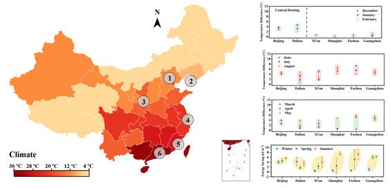 研究團隊通過多個城市、不同季節的室內模擬測試,證實了該智能窗戶具有室內溫度調節能力和建筑節能效果。選取北京、大連、西安、上海、福州和廣州作為代表性的試點城市,跨越北緯23°N 到40°N,覆蓋了亞熱帶、溫帶、沿海、內陸等不同地理和氣候特點,從2021年12月到2022年8月,進行了為期九個月的室內模擬測試(圖3)。在北方,模擬冬季供暖條件,利用智能窗戶的熱致變色效應,有效地降低了室內熱量的輻射逃逸,表現出優異的建筑節能效果(4.04-4.30 kJ m-3)。在春季,廣州的智能窗戶可將室內溫度降低4.0℃左右,并節能5.14 kJ m-3。在夏季,隨著氣溫進一步升高,智能窗戶在所有城市均展現優異的溫度調節能力(最高可達7.3℃),其建筑節能效率可達9.51 kJ m-3。