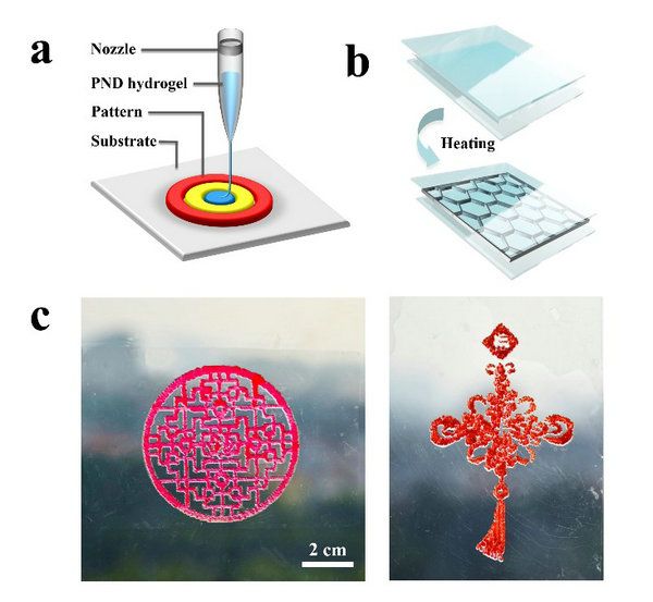 圖4 (a) 3D打印的圖案化水凝膠凝膠智能窗,(b)兼顧了窗戶可視化和光調節,(c)智能窗戶與窗花、中國結等文化元素結合。
