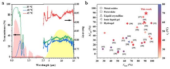 中大新聞網訊(通訊員付俊)建筑能耗約占全球能耗的40%,而窗戶是建筑內外能量交換的主要通道。利用智能窗戶調節建筑能量交換,是實現建筑節能的重要手段。國內外科學家們已經開發了各種智能窗戶,如:熱致變色型水凝膠智能窗戶(Joule, 2019, 3, 290-302),電致變色型鈣鈦礦智能窗戶(Nat. Commun. 2021, 12, 3360),輻射制冷型二氧化釩智能窗戶(Science, 2021, 374, 1501-1504)等。研究和開發“全氣候”型智能窗戶,既能在夏季阻隔過多的陽光直射,又能在冬季降低室內熱能的輻射損失,“冬暖夏涼”,不僅有利于顯著改善建筑內的舒適性,更有利于節約能源,促進低碳經濟發展。然而,大多數智能窗戶仍受制于需要供能、工作溫度適用范圍窄、光調節能力不足等問題。因此,研究可自發調節并適應復雜多變氣候的智能窗戶具有重要的科學意義和應用價值。