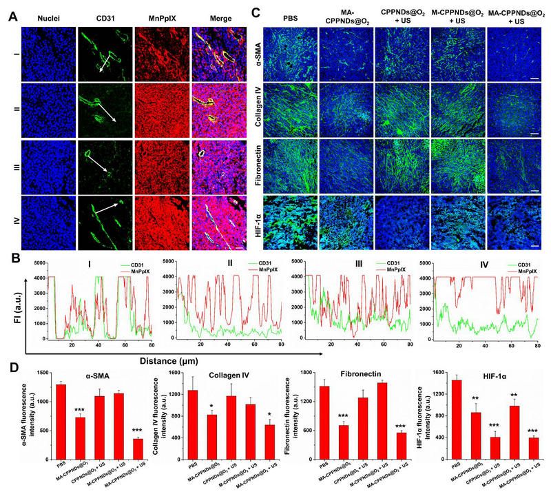 圖 超聲響應(yīng)聚合物PFH納米液滴用于PDAC的聲動(dòng)力治療。(A)超聲刺激或ECM重塑后,藥物在腫瘤組織中的滲透。I:未處理組;II:超聲處理組;III:ECM重塑組;IV:超聲刺激加ECM重塑組。(B)MnPpIX熒光強(qiáng)度與CD31標(biāo)記的腫瘤血管距離的定量分析。(C)納米藥物治療后PDAC腫瘤組織中ECM調(diào)節(jié)情況和乏氧緩解情況。(D)治療后對(duì)的腫瘤組織中α-SMA、IV型膠原、纖維連接蛋白和HIF-1α的熒光強(qiáng)度的半定量分析。