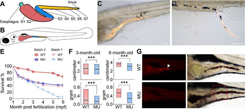 圖1:斑馬魚腸道幾丁質(zhì)形態(tài)以及敲除前后的表型變化(A:斑馬魚成魚腸道分段示意圖;B:斑馬魚幼魚腸道分段示意圖;C,D:斑馬魚幼魚腸道幾丁質(zhì)膜染色圖,橘色為幾丁質(zhì)膜;E:一到六月齡斑馬魚生存率比較;F:三和六月齡斑馬魚體長(zhǎng)體重比較,WT=野生型,MU=突變型;G:敲除前后幼魚腸道幾丁質(zhì)膜以及消化過(guò)程對(duì)比,白色箭頭指向幾丁質(zhì)膜,紅色方框框出陷入腸絨毛間的微珠)。