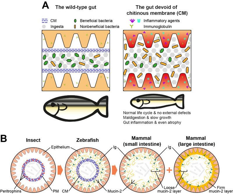 中山大學(xué)生命科學(xué)學(xué)院徐安龍教授和黃盛豐教授團(tuán)隊(duì)長(zhǎng)期專注于海洋與水生動(dòng)物的黏膜功能及其免疫防御機(jī)制。最近,他們利用斑馬魚模型,第一次對(duì)魚類腸道幾丁質(zhì)膜的在消化和免疫中的不同效用進(jìn)行了解析,發(fā)現(xiàn)相比昆蟲(chóng)等無(wú)脊椎動(dòng)物,斑馬魚幾丁質(zhì)膜的分區(qū)消化功能依然重要,但屏障免疫作用下降,且不再是存活與繁殖的必需結(jié)構(gòu)。