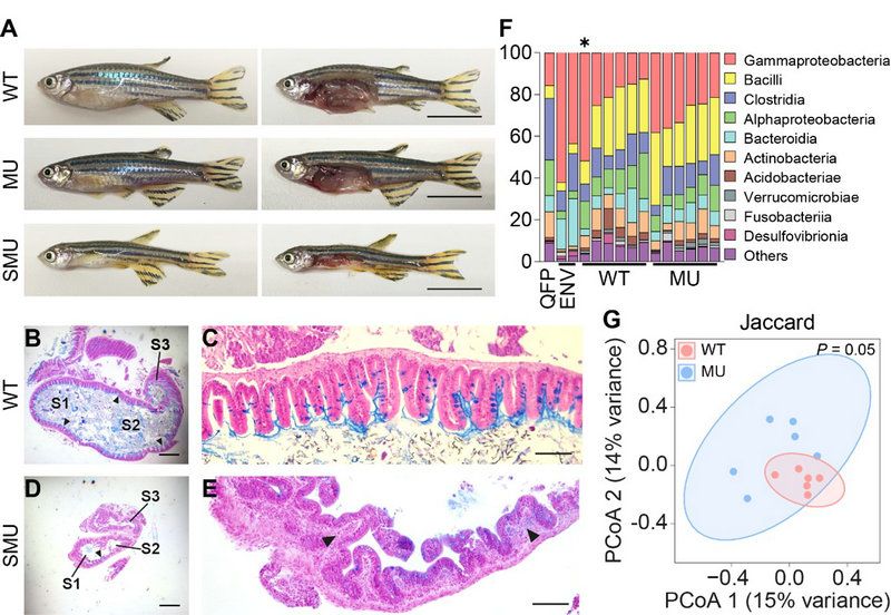 圖2:斑馬魚腸道萎縮的圖以及腸道微生物變化(A:六月齡不同斑馬魚對(duì)比,WT=健康野生型,MU=健康突變型,SMU=生病突變型;B – E:成魚腸道切片阿爾新藍(lán)染色圖,C為B的局部放大,E為D的局部放大;F:斑馬魚腸道微生物物種柱狀圖,QFP=濾紙對(duì)照,ENV=環(huán)境水樣對(duì)照;G:斑馬魚腸道微生物主坐標(biāo)分析圖)。