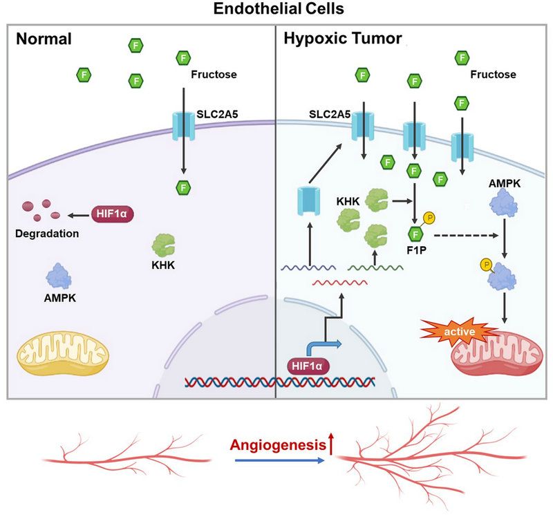 圖1. 腫瘤低氧微環境通過HIF1a上調肝癌內皮細胞中果糖轉運蛋白及代謝酶的表達,增強果糖代謝,繼而激活內皮細胞的AMPK信號,上調線粒體呼吸,提升內皮細胞的遷移和增殖能力,最終促進肝癌血管生成和腫瘤進展。
