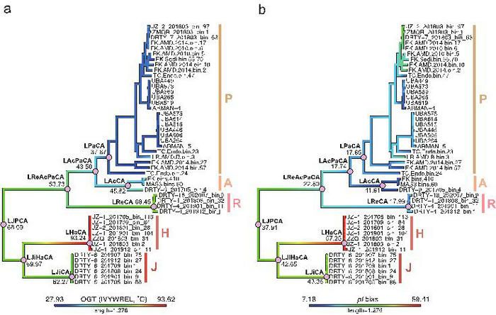 精衛古菌目與早期發現的DPANN古菌——ARMAN古菌中的Parvarchaeales 形成姊妹支系(圖一)。通過代謝潛能分析發現,前者具有典型的DPANN古菌“回收型“的代謝方式,即利用外部環境或宿主“現成”的核苷酸和氨基酸等小分子合成自身大分子并產生能量。而Parvarchaeales則具有更加多樣的代謝能力,可能通過糖酵解、三羧酸循環和電子傳遞鏈多種方式產能(圖二)。通過比較基因組學分析,以及最適生長溫度、最適生長溫度pH(pI)等“逆向生態學”分析表明,精衛古菌目中的新屬海燕古菌屬是一種超嗜熱菌,其最適生長溫度(OGT)超過80?C。它們通過編碼超嗜熱菌特異性基因反向螺旋酶(rgy),以及基因組和所編碼蛋白組的本身特征,例如基因組精簡化、高編碼密度、高重疊基因比例和高溫特異性的基酸組成偏好性來適應極端高溫環境(圖三)。而對于嗜酸類群,包括精衛古菌屬和Parvarchaeales 支系,則具有由水平基因轉移主導獲得的差異化的酸適應性機制。分別通過特定基因形成難以通透質子的細胞膜,和外排質子以維持細胞內部環境穩定。進一步的進化歷史重構表明,這些古菌支系具有共同的熱起源,在后續進化中,海燕古菌屬逐步適應更高溫的生境,成為超嗜熱菌,而Parvarchaeales支系則逐漸適應低溫環境。另外,祖先節點具有近中性的等電位點(pI),表明共同祖先適應中性環境生存,而對酸性環境的適應性可能為后續通過水平基因轉移主導的進化所產生(圖四)。
